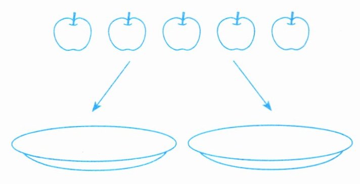 放在两个盘子里,可以怎么放?请你画一画,算一算。(每个盘子里都要放苹果)