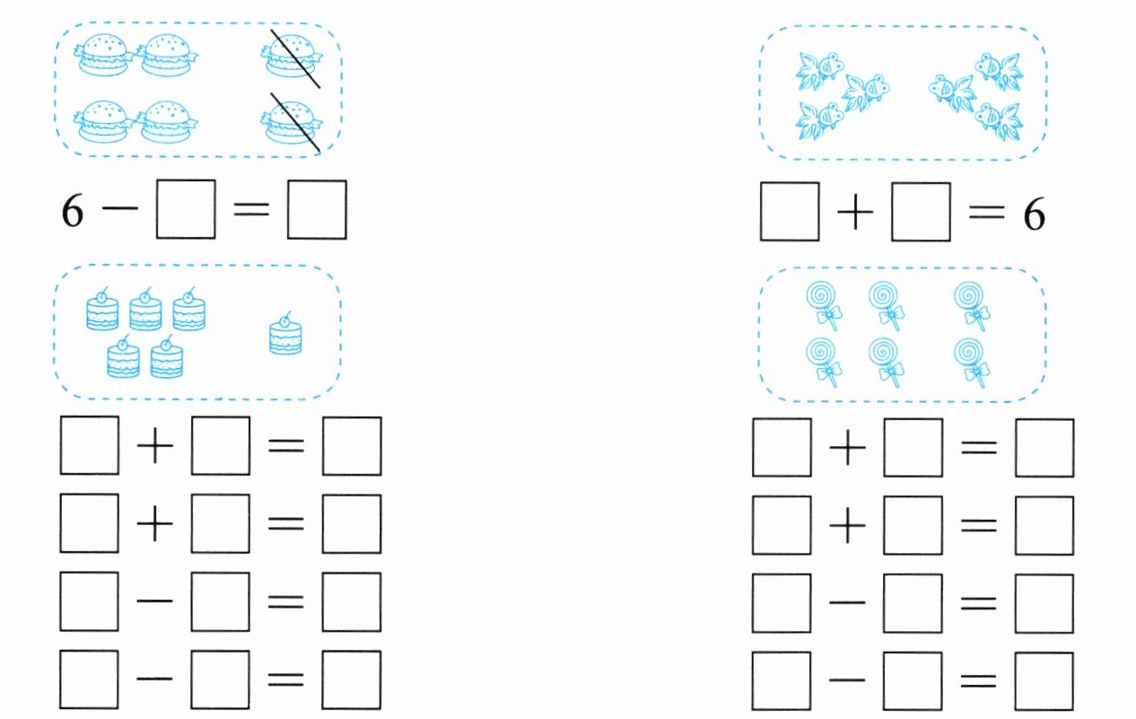 $6-2=4$;$3+3=6$;$5+1=6$,$1+5=6$,$6-5=1$,$6-1=5$;$4+2=6$,$2+4=6$,$6-4=2$,$6-2=4$