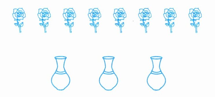1. 往3个花瓶里插花,每个花瓶可以插几朵?连一连,算一算。(每个花瓶里都要有花)