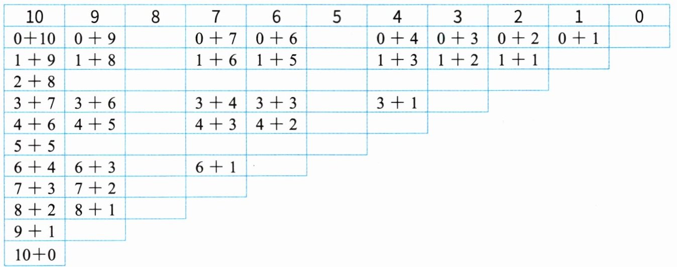 | 10 | 9 | 8 | 7 | 6 | 5 | 4 | 3 | 2 | 1 | 0 || 0+10 | 0+9 | 0+8 | 0+7 | 0+6 | 0+5 | 0+4 | 0+3 | 0+2 | 0+1 | 0+0 || 1+9 | 1+8 | 1+7 | 1+6 | 1+5 | 1+4 | 1+3 | 1+2 | 1+1 | 1+0 | || 2+8 | 2+7 | 2+6 | 2+5 | 2+4 | 2+3 | 2+2 | 2+1 | 2+0 | | || 3+7 | 3+6 | 3+5 | 3+4 | 3+3 | 3+2 | 3+1 | 3+0 | | | || 4+6 | 4+5 | 4+4 | 4+3 | 4+2 | 4+1 | 4+0 | | | | || 5+5 | 5+4 | 5+3 | 5+2 | 5+1 | 5+0 | | | | | || 6+4 | 6+3 | 6+2 | 6+1 | 6+0 | | | | | | || 7+3 | 7+2 | 7+1 | 7+0 | | | | | | | || 8+2 | 8+1 | 8+0 | | | | | | | | || 9+1 | 9+0 | | | | | | | | | || 10+0 | | | | | | | | | | |