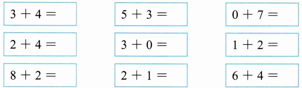 $\begin{array}{ccc}\boxed{3 + 4 = 7} & \boxed{5 + 3 = 8} & \boxed{0 + 7 = 7} \\\boxed{2 + 4 = 6} & \boxed{3 + 0 = 3} & \boxed{1 + 2 = 3} \\\boxed{8 + 2 = 10} & \boxed{2 + 1 = 3} & \boxed{6 + 4 = 10} \\\end{array}$