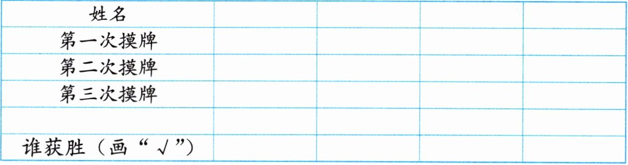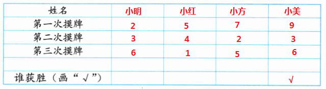 根据本节课的游戏规则,四位同学一起玩摸牌游戏,摸到几就在表格中填上数字几,看看最后谁获胜。
