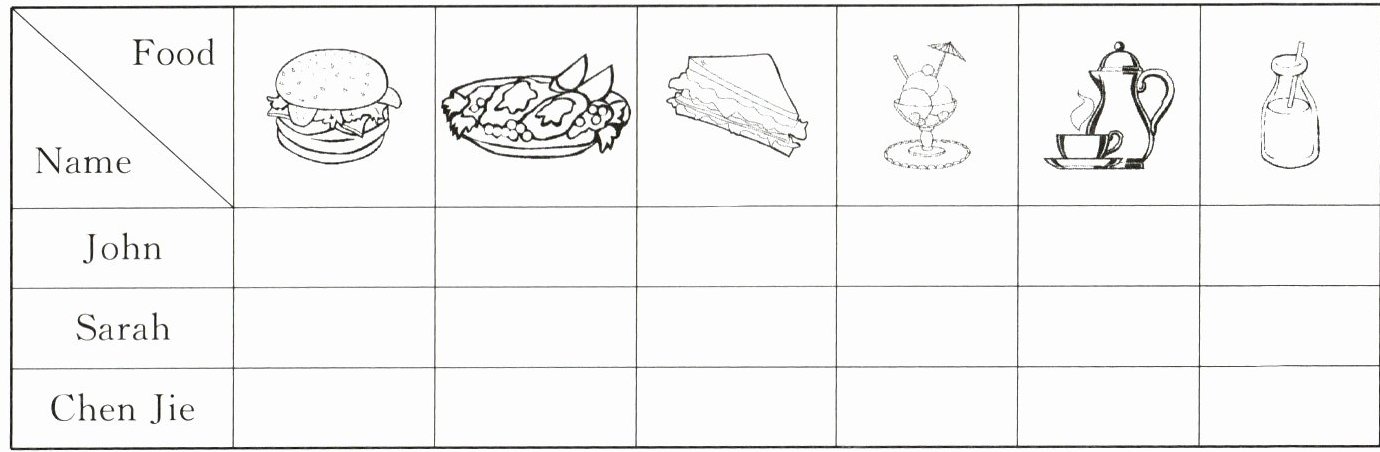 五、Listen, tick and write. 听对话,在与听到的内容相应的方框中打“√”,并填入所缺的单词。