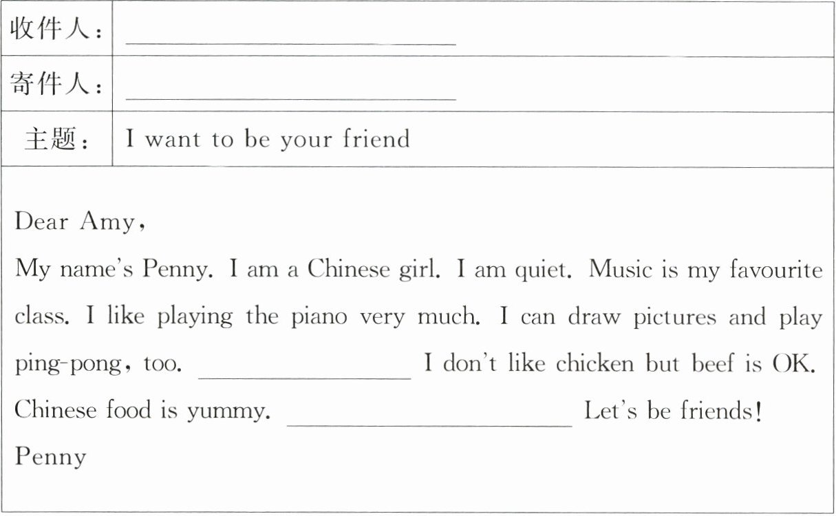 )5. Penny doesn’t like music.(C)Finish the email. 如果你是 Amy,请完成这封回复的电子邮件。
