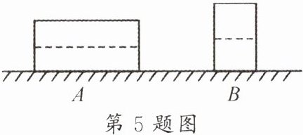 5. 如图,质量分布均匀的长方体重物A、B,密度分别为ρ_A和ρ_B,底面积分别为S_A和S_B,且S_A > S_B,将它们放在水平面上,它们对地面的压强相等。现水平割去上半部分(如图中虚线所示),剩余部分对地面的压强分别为p_A和p_B,对地面的压力分别为F_A和F_B,下列物理量大小比较的关系正确的是(