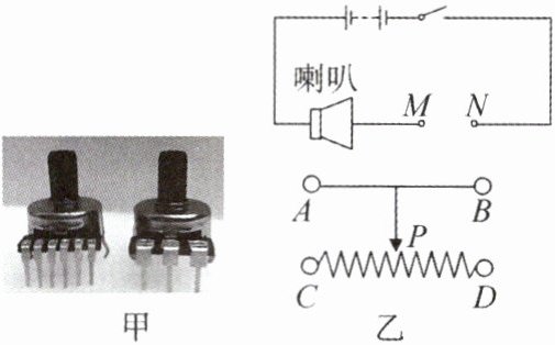 【跟踪练习10】 如图甲所示,是音响上音量调节装置,其简化电路如图乙所示,需在$M$、$N$间接入一个滑动变阻器,使滑片$P$向右移动时接入电路中的电阻变大。下列连接方式中可行的是(