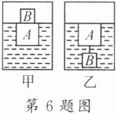 6. 如图,$A$、$B$两物块以不同方式组合,分别静止在甲、乙两种液体中,由此可判断 $\rho_{甲}$