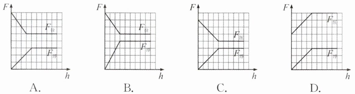 5. 小明用如图所示的装置将下沉的小重物逐渐缓慢下沉,烧杯中水能没过重物但不溢出,他作出了重物受 $F_{浮}$、$F_{拉}$、烧杯对桌面的压力 $F_{压}$随物体下表面到水面距离变化的图像,下列四图可能正确的是(