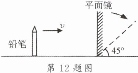 12. 如图,平面镜竖直放置在水平面上,一支直立的铅笔从平面镜前40cm处,以5cm/s的水平速度垂直向平面镜匀速靠近。下列说法正确的是(