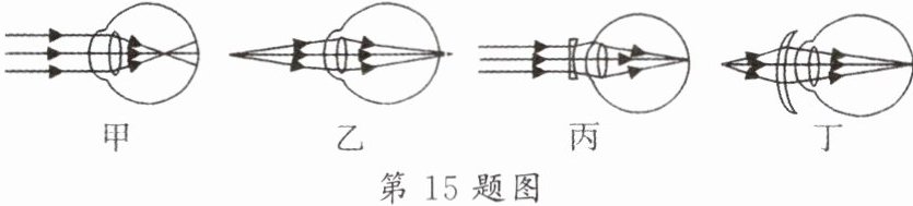 15. 近年来,青少年学生中近视眼呈上升趋势,而且从小学五、六年级开始,其近视率明显上升。如图,图中能反映近视眼的成像情况及其矫正原理的是(