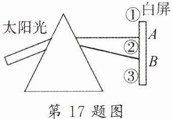 17. 如图,太阳光经过三棱镜后,被分解为红、橙、黄、绿、蓝、靛、紫七色光,这种现象叫作光的