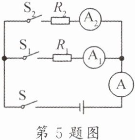 5. 小明在研究并联电路电流特点时,根据如图所示电路图连接好电路并闭合开关 $ S $ 和 $ S_1 $。当他再闭合开关 $ S_2 $ 时,电流表示数变化正确的是(电源电压不变)(