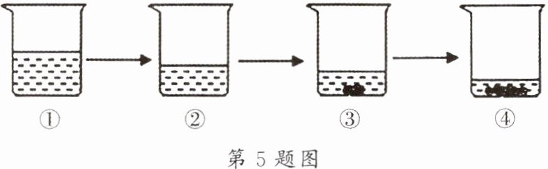 5. 如图所示为蒸发氯化钠溶液的实验过程,其中$ ①→②→③ $为恒温蒸发过程,$ ③→④ $为升温蒸发过程,②溶液恰好为饱和状态,分析实验过程,正确的判断是(