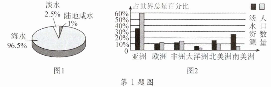 1. 图1是地球上水的分布图,图2为各大洲可利用的淡水资源和人口数量各占世界总量的百分比示意图,下列说法错误的是(