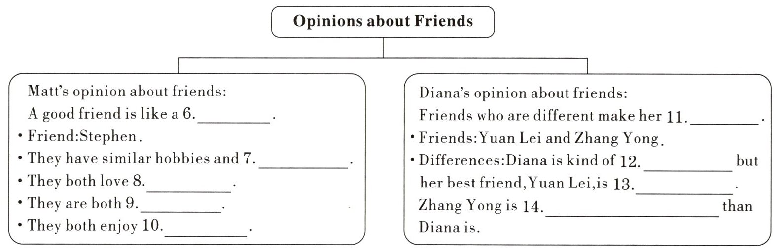 6. mirror 7. interests 8. sports 9. serious 10. reading 11. better 12. shy 13. outgoing 14. more straightforward