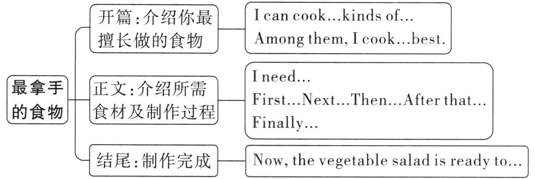 学习做饭,不仅能培养初中生的劳动能力,还能培养初中生最基本的生存技能。作为初中生,你一定会做某种食物吧。请你根据以下思维导图的提示,用英语写一篇短文,介绍你最拿手的一种食物。