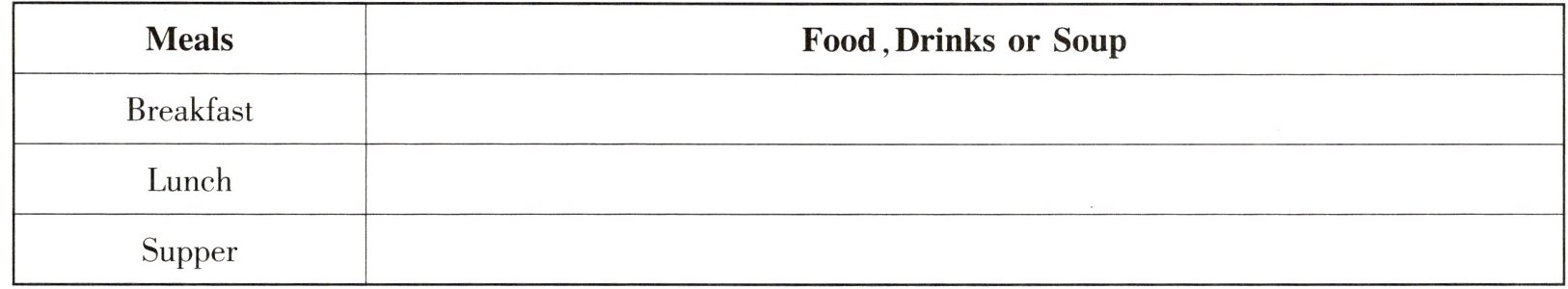 | Meals | Food, Drinks or Soup |