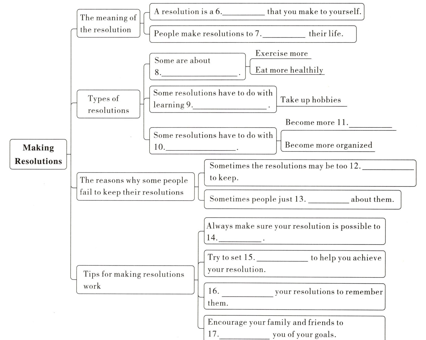 Ⅰ.1.possible 2.ahead 3.failed 4.final 5.relationship Ⅱ.6.promise 7.improve 8.physical health 9.new things 10.self-improvement 11.confident 12.difficult 13.forget 14.achieve 15.mini-goals 16.Write down 17.remind