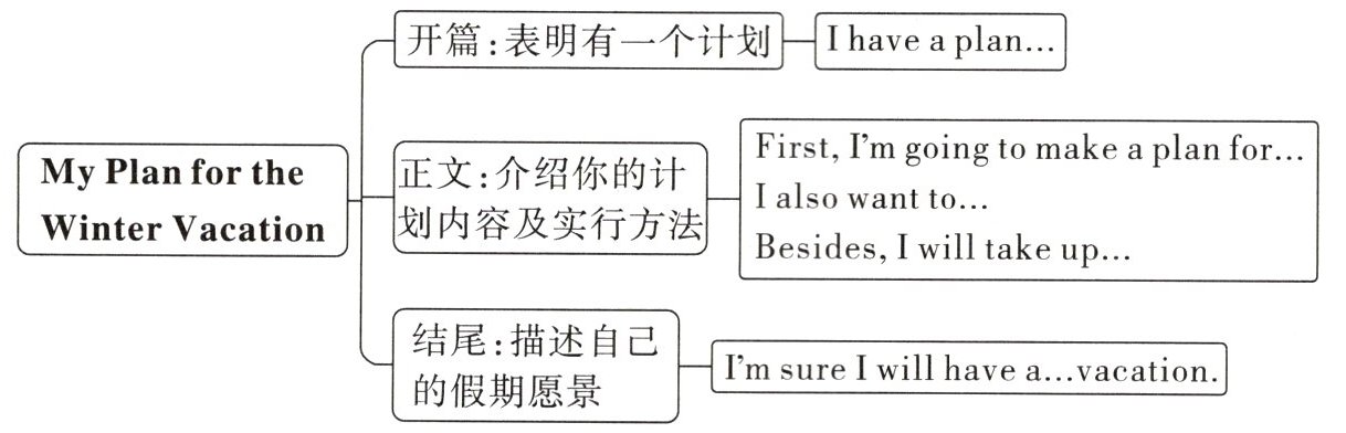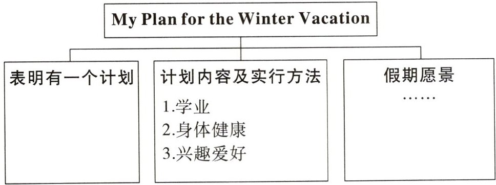 时间过得真快,寒假就快要到了。为了让自己的假期过得更精彩、更充实、更有意义,同学们一定有很多打算。请以“My Plan for the Winter Vacation”为题,根据以下思维导图的提示,用英语写一篇短文。