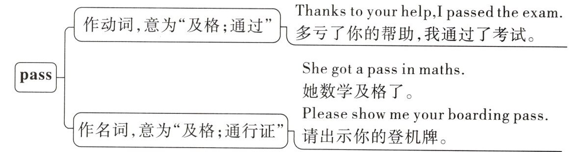 作名词,意为“及格;通行证”:She got a pass in maths. 她数学及格了。Please show me your boarding pass. 请出示你的登机牌。