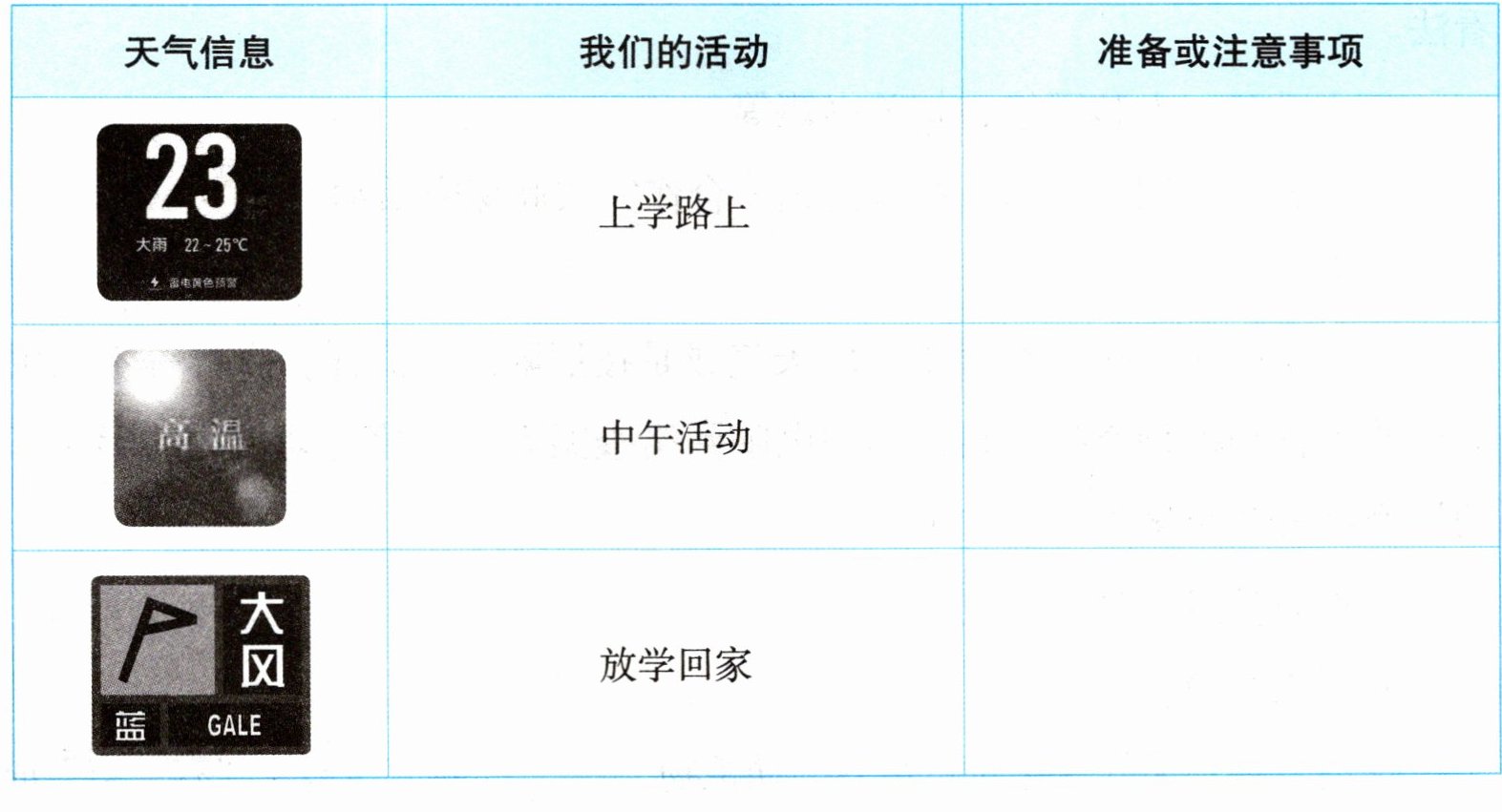 2. 请根据下面的天气信息,写出我们需要做的准备或注意事项。