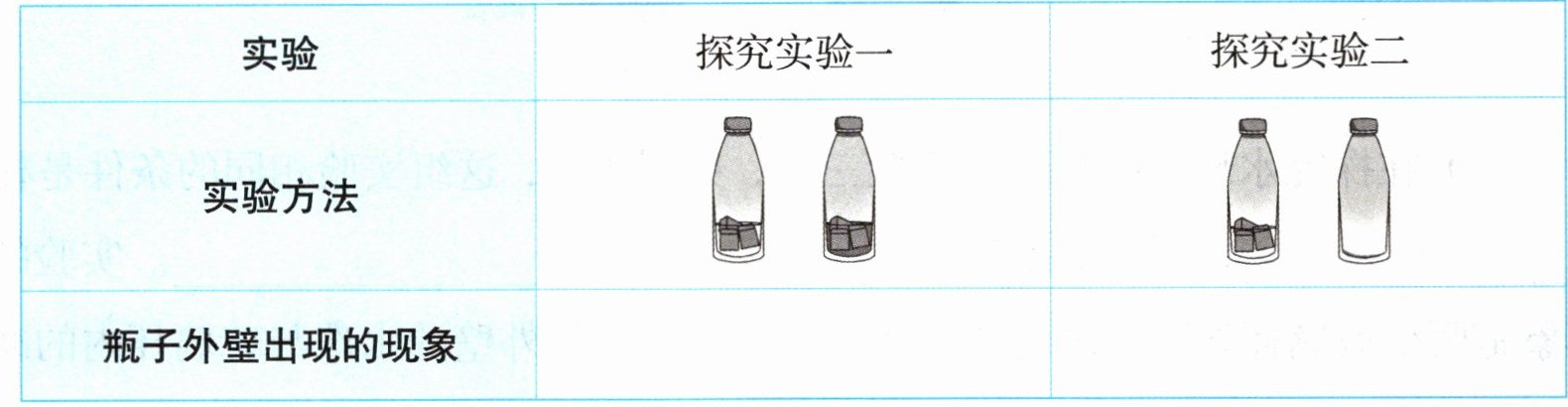 2. 探究实验二,将一个空的塑料瓶盖紧瓶盖放入冰水中冷却一段时间,取出,用干毛巾擦干上面沾的冰水,再向另一个塑料瓶中快速加入一些冰水,一段时间后,记录实验现象。