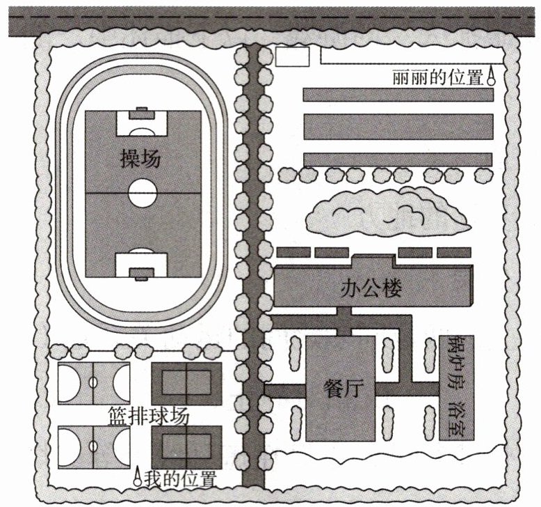 探究问题:通过本课的学习,你已经知道如何准确地描述位置了。这是校园部分平面图,请你根据这幅图,给你的好朋友丽丽打电话描述你的方向和距离,使她能来到你所在的位置。
