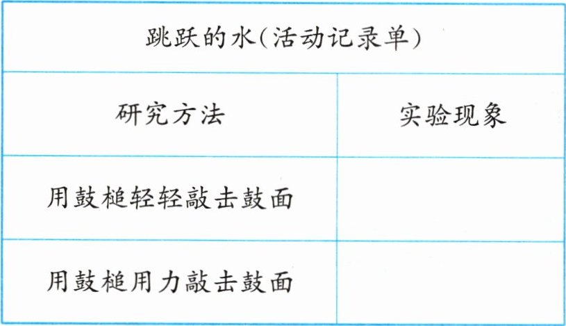 1. 将适量水倒在鼓面上,用鼓槌轻轻敲击鼓面,认真观察实验现象并记录。