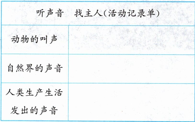探究过程:课间活动时请到操场上仔细听一下都有哪些声音。请将你听到的声音按发声物体进行分类,并填写在活动记录单中。