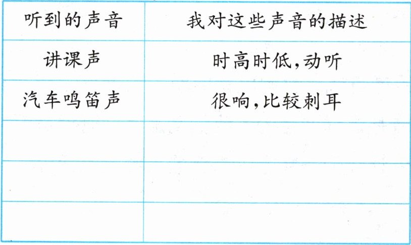 3.(此题为开放式问题,答案合理即可) 听到的声音 我对这些声音的描述 讲课声 时高时低,动听 汽车鸣笛声 很响,比较刺耳 虫鸣声 低且弱 雨滴声 较低,断断续续的 读书声 响亮,动听