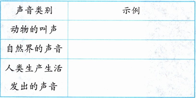 2.(此题为开放式问题,答案合理即可) 声音类别 示例 动物的叫声 鸟叫声、虫鸣声 自然界的声音 雨滴声、打雷声 人类生产生活发出的声音 喇叭声、歌声