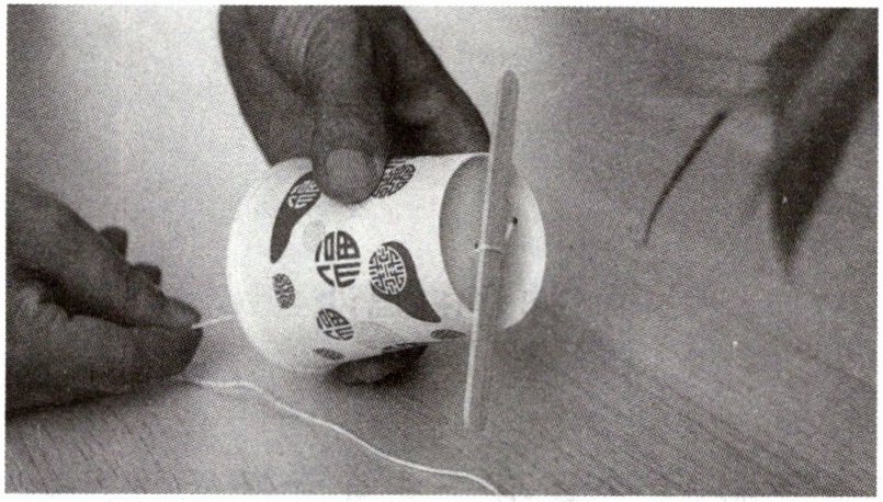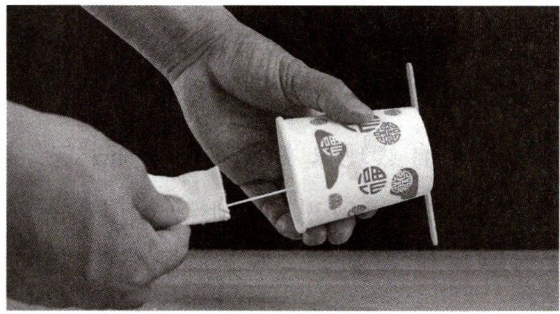 步骤五:用蘸湿的纸包住细绳用力往后拉,就能听到杯子内部传来一阵“咯咯”声,就像母鸡的叫声一样可爱有趣。