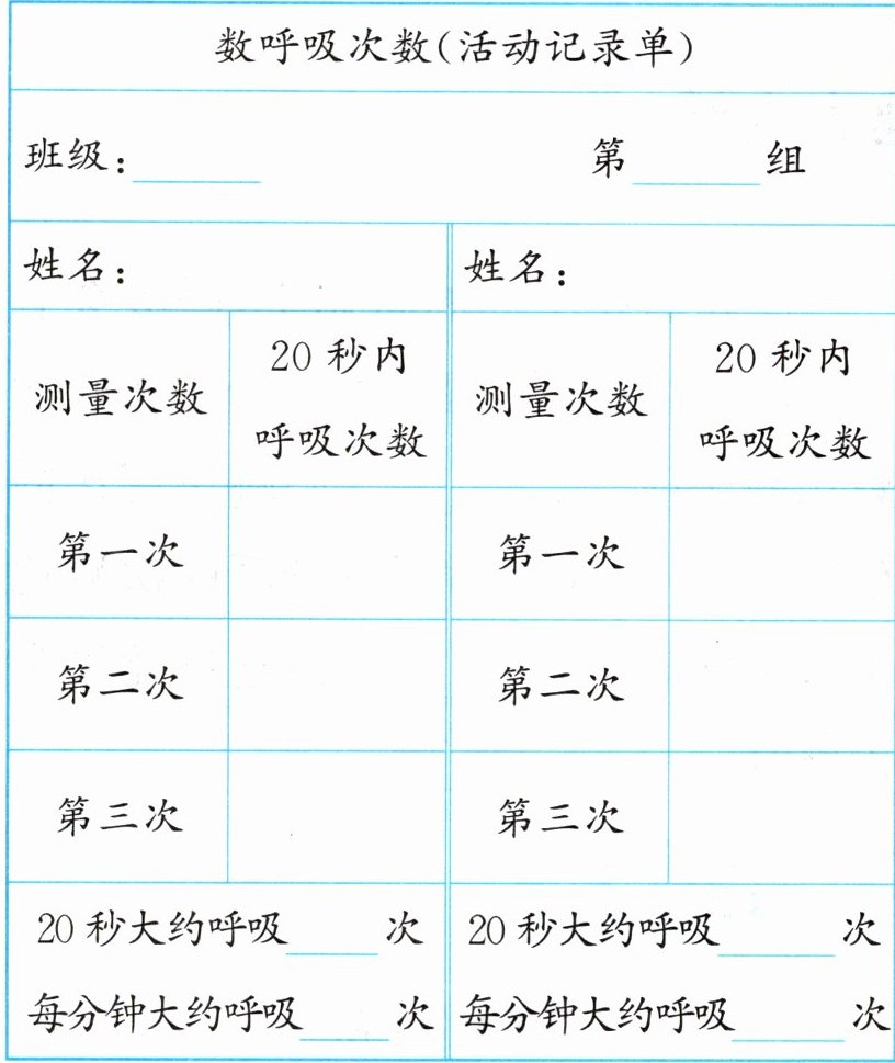 探究过程:计时开始时,开始数数。计时结束时,如果被数的同学正在进行第5次的吸气或者呼气,记为5次,以此类推。