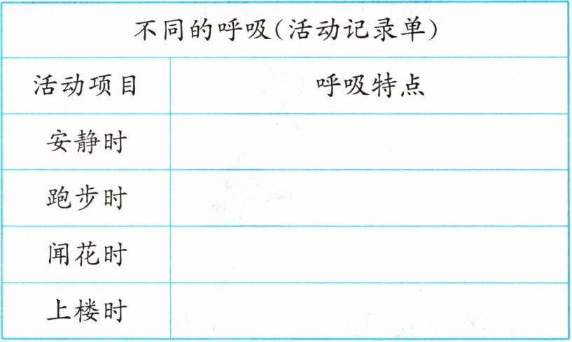 探究过程:在做完不同的活动后观察呼吸的变化,了解进行不同活动时呼吸的特点。