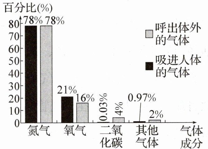 通过观察柱形图中的数据,我发现:呼出的气体和吸入的气体相比,呼出的气体中,