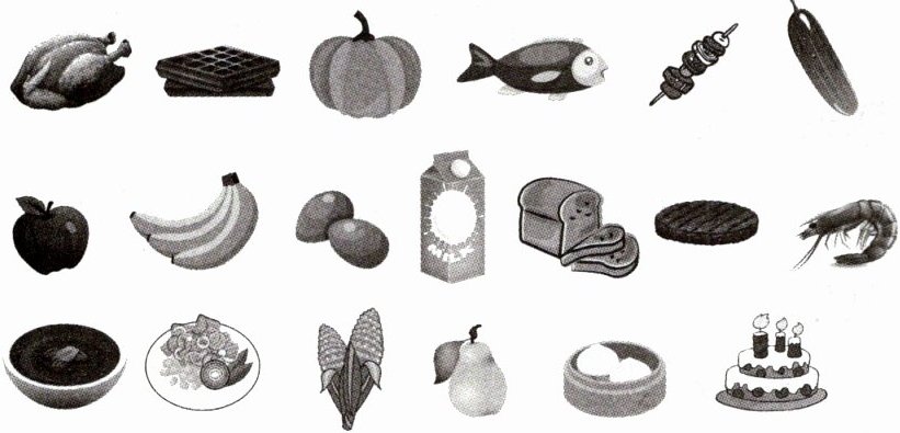 食物除了可以分为肉类、菜类、主食类以外,还可以有其他的分类方法,比如按照我们的喜好,可以将食物分为喜欢吃的和不喜欢吃的。请你和同学讨论一下,还有哪些分类方法,再从下面的图片中找出两种对应的食物,将它们的名称写下来。