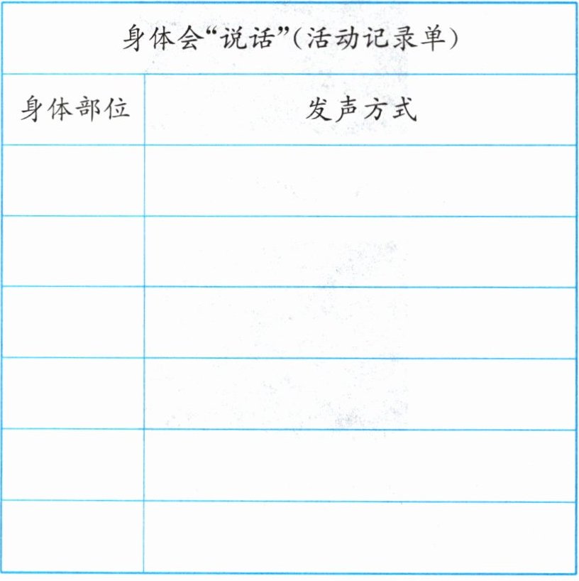 与同伴配合,尝试让我们身体的不同部位发声,并完成活动记录单。