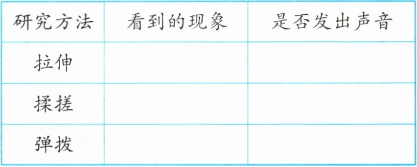 | 弹拨 | 橡皮筋上下晃动 | 听到橡皮筋发出“嗡嗡”声 |