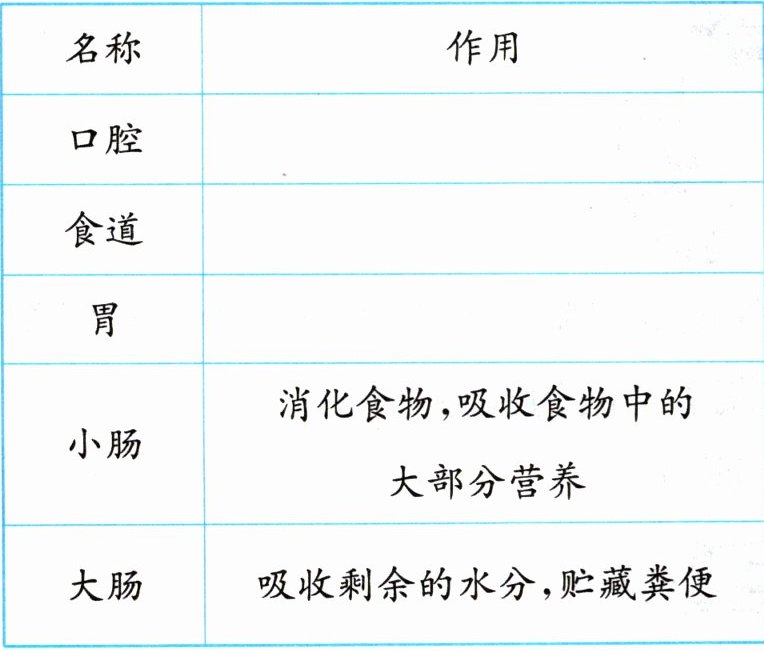 2 名称 作用 口腔 嚼碎食物,初步消化食物 食道 运送食物 胃 消化食物 小肠 消化食物,吸收食物中的大部分营养 大肠 吸收剩余的水分,贮藏粪便