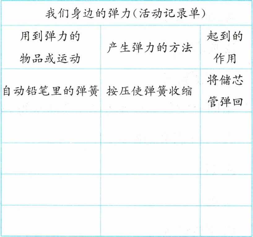 探究过程:找一找生活中哪些地方用到了弹力,记录在下面的活动记录单中,并思考弹力分别起到了什么作用。