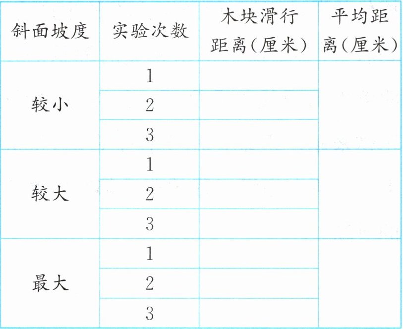2. 将一辆小车分别从三个不同坡度的斜面上的同一位置释放,小车滑下后撞击水平面上的木块,测量木块每次被撞后滑行的距离,将实验数据记录在下表中,并完成下面的实验发现。
