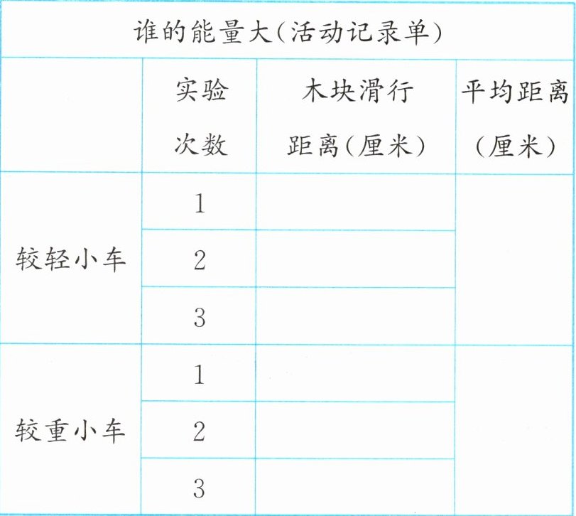 探究准备:活动记录单、重量不同的两辆小车(可在一辆小车上加重物)、斜面、木块、刻度尺。