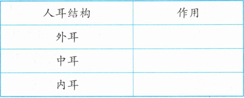 1. 人的外耳、中耳、内耳主要有什么作用?把你知道的记录在下面的表格中。
