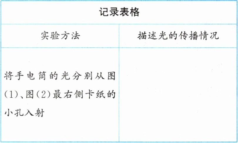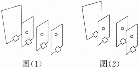 1. 如下图(1)和(2)所示,观察光穿过卡纸上的小孔时的情况,其中三张卡纸在同一位置打有小孔。图(1)中三个小孔保持在同一直线上,每张卡纸间距15厘米,最后一张卡纸作为光屏。图(2)中右侧第二张卡纸与另外两张带有小孔的卡纸不在一条直线上。