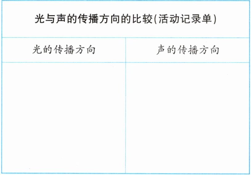 探究过程:小组成员合作,探究分析光与声传播方向的特点,填写在活动记录单中。