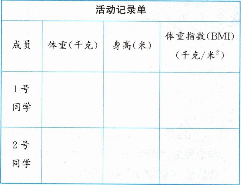 探究过程:小组成员合作,根据测量的结果对体重指数进行计算,并填写在活动记录单中。