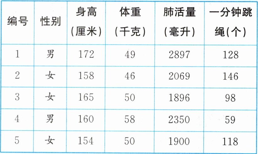 2. 新天地小学五年级(5)班部分学生的体质记录如下表。根据教材中的体质标准信息回答下列问题。