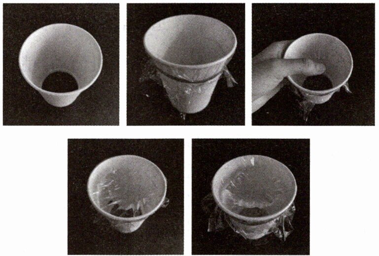 步骤二:用透明保鲜膜盖住纸杯口,并用皮筋绑紧。