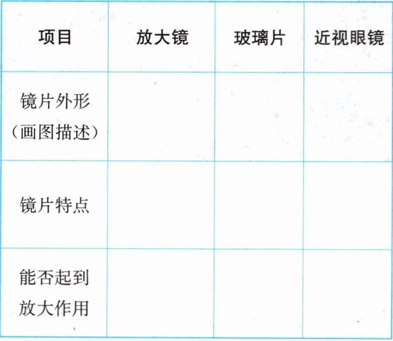 1. 请你观察放大镜的镜片、玻璃片和近视眼镜的镜片。从侧面看,它们的外形是什么样的?它们各自有什么特点?用它们分别观察书上的同一个字,有什么不同?把你的发现填在表中。