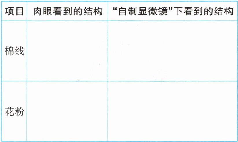 2. 分别用肉眼和“自制显微镜”观察棉线和花粉,会有什么发现?将你的发现填在表格中。
